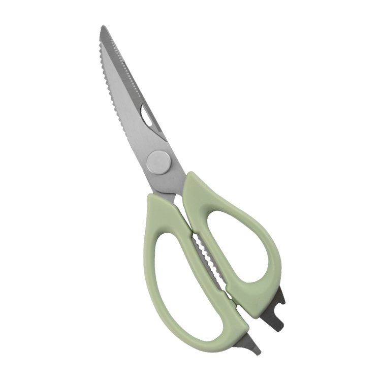 Fabricadas en acero inoxidable de alta calidad, estas tijeras de cocina multifuncionales cuentan con hojas afiladas que permiten desde picar hierbas hasta cortar envases resistentes con facilidad. Los bordes serrados proporcionan un agarre seguro en ingredientes resbaladizos, mientras que los mangos ergonómicos en un suave verde pastel reducen la fatiga de la mano durante un uso prolongado. Su funcionalidad integrada las distingue: los abrebotellas y abrefrascos incorporados las convierten en una verdadera solución integral. Como producto de un fabricante líder de tijeras de cocina, estas tijeras están diseñadas para durar, resistiendo la oxidación y manteniendo su filo con el paso del tiempo. En las pruebas, cortaron sin esfuerzo aves, verduras e incluso cartón, demostrando su eficacia en diversas situaciones.