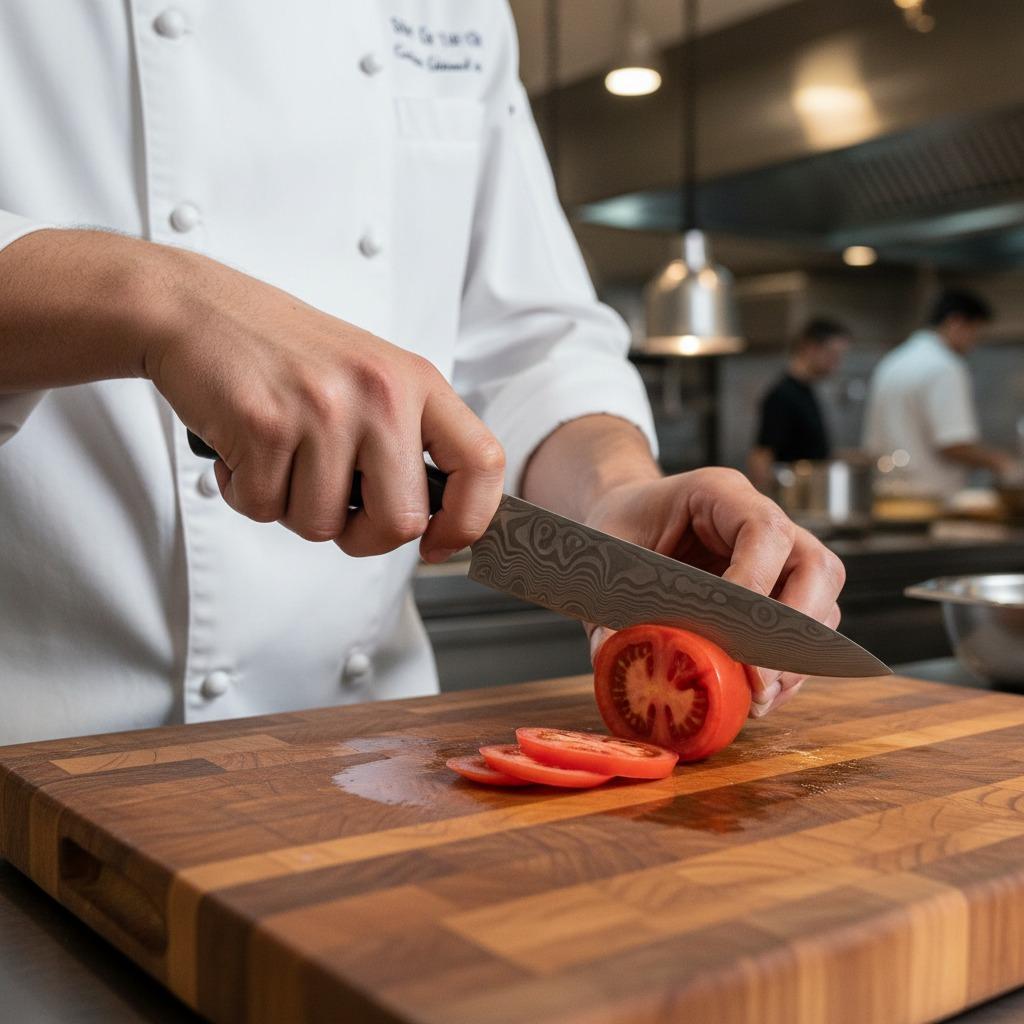 Un couteau de cuisine en acier de Damas de qualité peut être plus léger et mieux équilibré que de nombreuses lames en acier monobloc, tout en conservant un tranchant professionnel. Cependant, il nécessite un lavage à la main et un huilage occasionnel : la beauté a un prix.