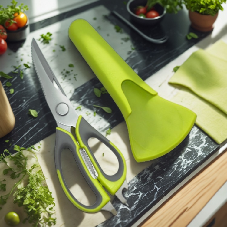 É aqui que um conjunto de tesouras de cozinha verdadeiramente multifuncional brilha. Imagine uma única ferramenta que possa cortar de maneira limpa ervas delicadas, poder através de ossos de frango resistentes com sua lâmina serrilhada e até abrir uma tampa de garrafa teimosa. O design apresenta uma alça ergonômica confortável em um impressionante verde-limão e cinza escuro, garantindo uma aderência segura e reduzindo a fadiga das mãos. Criados a partir de aço inoxidável de alta qualidade, as lâminas são construídas para durabilidade, nitidez e resistência à ferrugem, fornecendo um corte limpo e preciso todas as vezes.