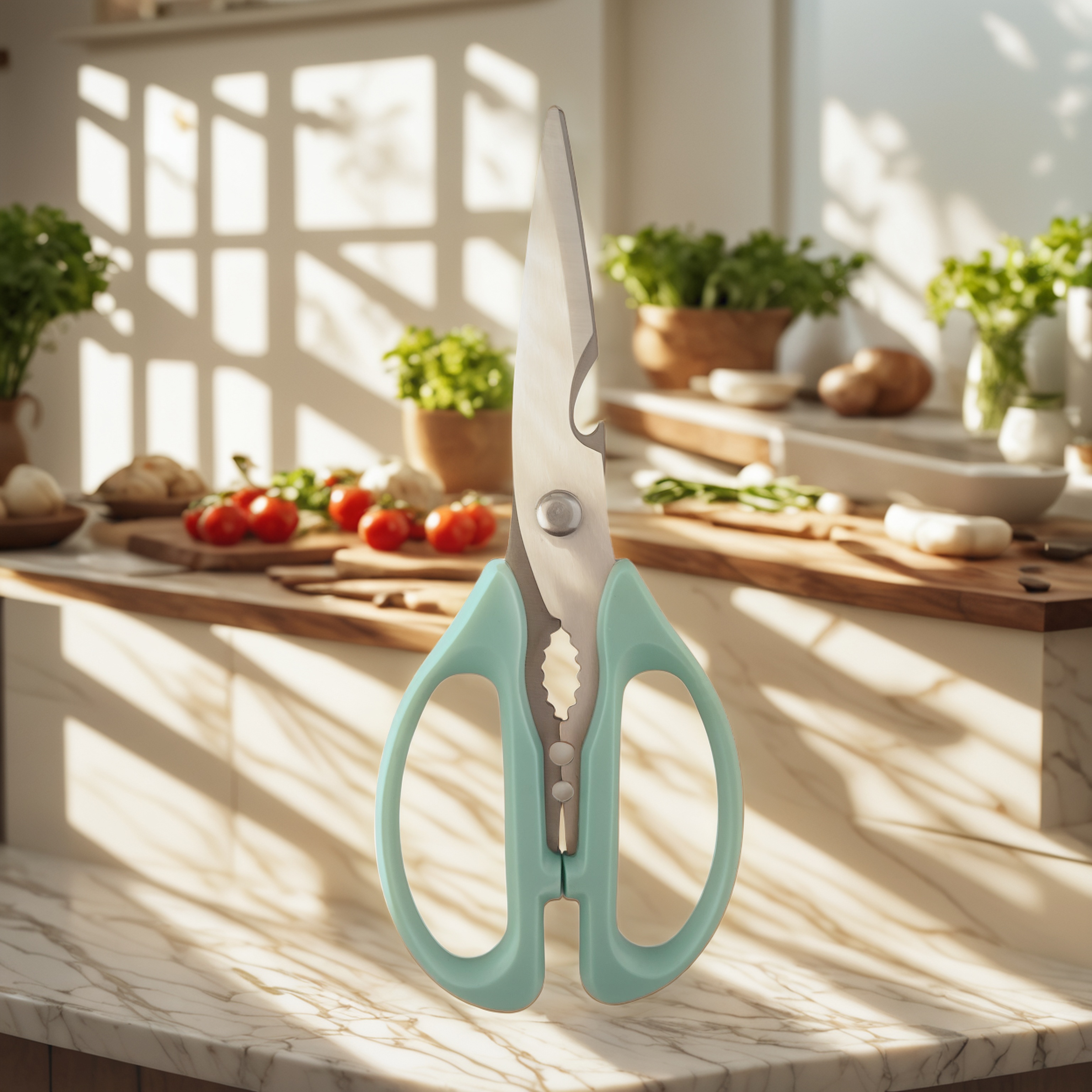 这些剪刀是为了性能和易用性而建造的。刀片是用高质量的不锈钢锻造的,确保每次都清晰,精确地切割,无论您是修剪家禽,剪裁新鲜的绿色还是打开密封的袋子。符合时尚的Aqua手柄的人体工程学设计允许舒适且安全的抓地力减轻手动疲劳。除了切割外,它们的实用程序还具有巧妙的内置功能。许多型号包括一个集成的开瓶器和位于手柄之间的坚固胡桃夹子,进一步证明了它们的多功能价值。